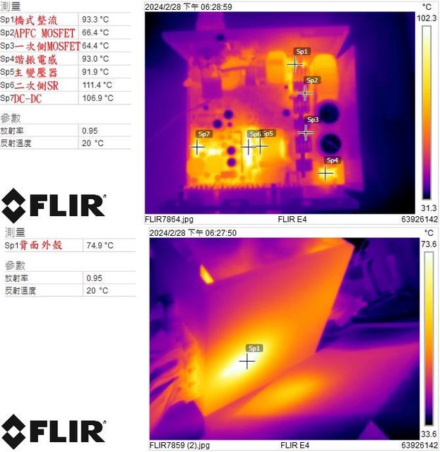 ▼電源供應器滿載輸出下內部(上圖)及背面外殼(下圖)的紅外線熱影像圖(附註:安裝位