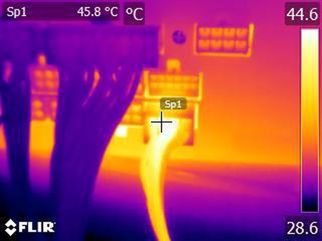 ▼單條EPS 4+4P連續輸出28A(336W)10分鐘後的電源端模組化接頭紅外線熱影像圖(附註:
