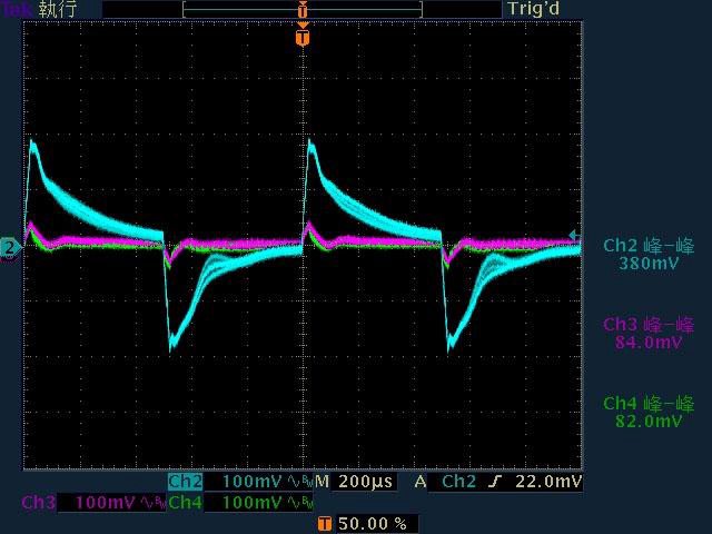 以下波形圖,CH2藍色波形為12V電壓波形,CH3紫色波形為5V電壓波形,CH4綠色波形為