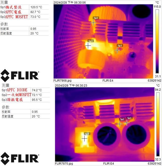 ▼電源供應器滿載輸出下橋式整流/APFC電感/APFC MOSFET(上圖)及APFC DIODE/一次側