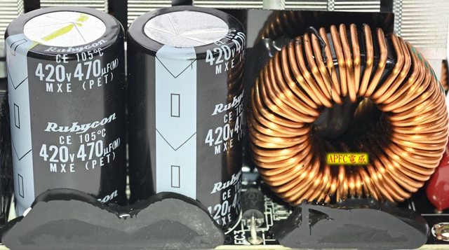 ▼環狀磁芯APFC電感左側的APFC電容採用2個Rubycon 420V 470μF MXE系列105℃電解電