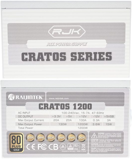 表、保護圖示、RAIJINTEK商標、原廠網址、CRATOS系列名稱、80PLUS金牌認證