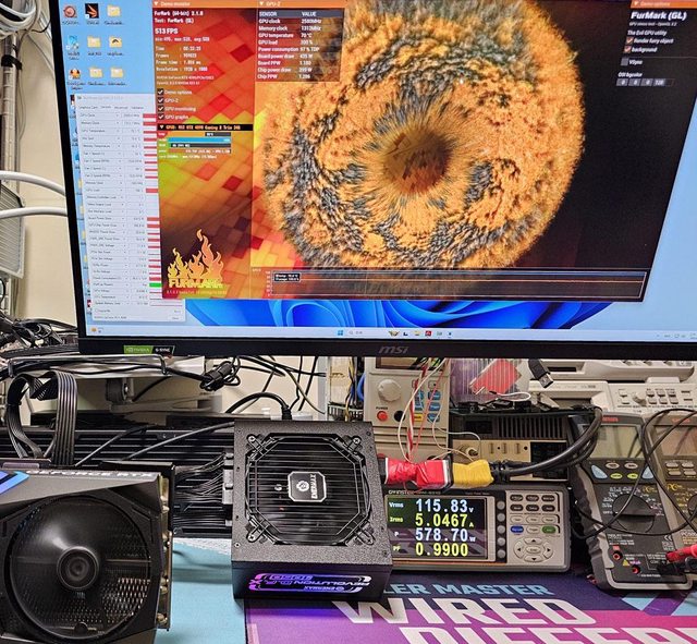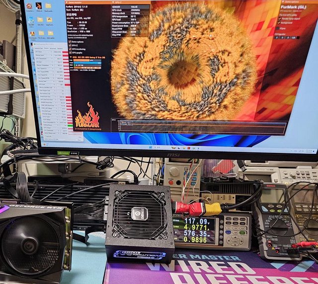 ▼用隨附的雙頭12VHPWR模組化線材連接MSI GEFORCE RTX 4090 GAMING X TRIO進行測試