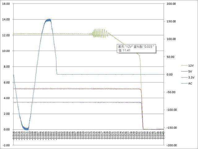 ○綜合全負載輸出狀態切斷AC輸入模擬電力中斷,12V於13ms開始出現波動,於23ms降至