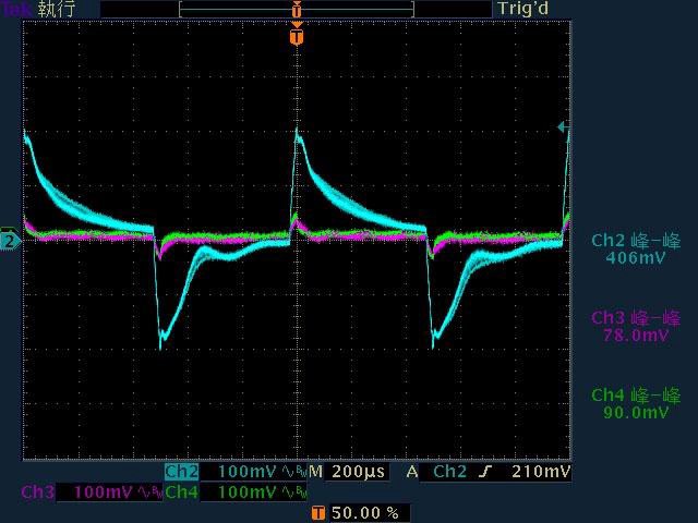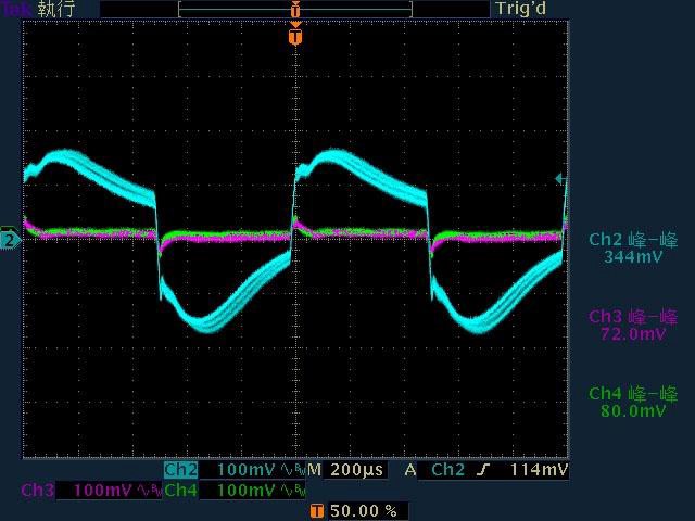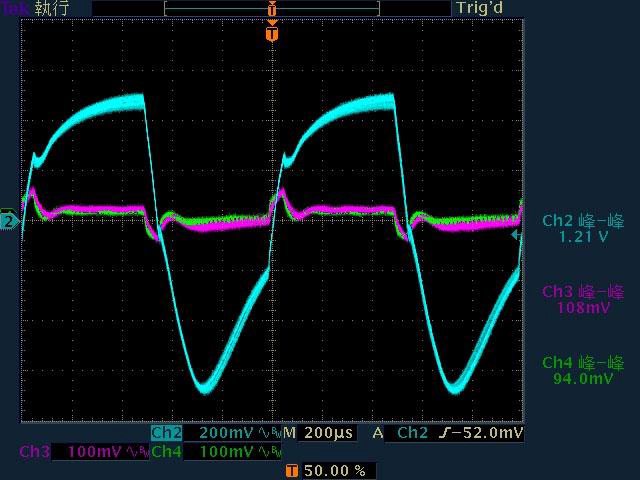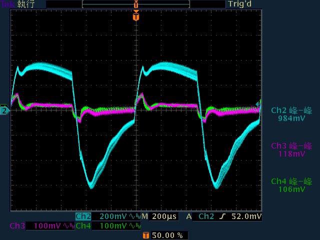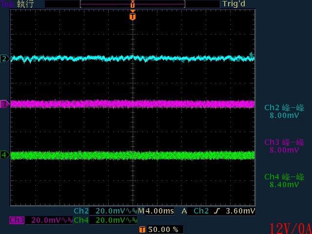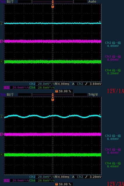 ○輸出無負載時12V有小振幅低頻漣波,輸出12V/1A無明顯漣波,輸出12V/2A以上12V漣波