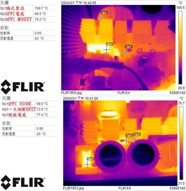 ▼電源供應器滿載輸出下橋式整流/APFC電感/APFC MOSFET(上圖)及APFC DIODE/一次側