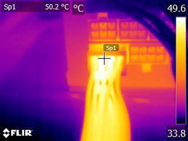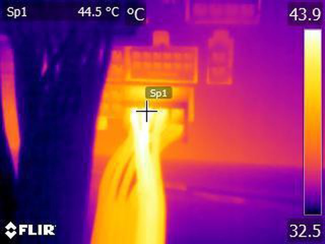 ▼單條PCIE 6+2P連續輸出21A(252W)10分鐘後的電源端模組化接頭紅外線熱影像圖(附註