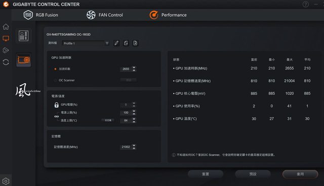 Performance頁面提供調校GPU加速時脈、記憶體時脈、電壓與溫度上限等功能。