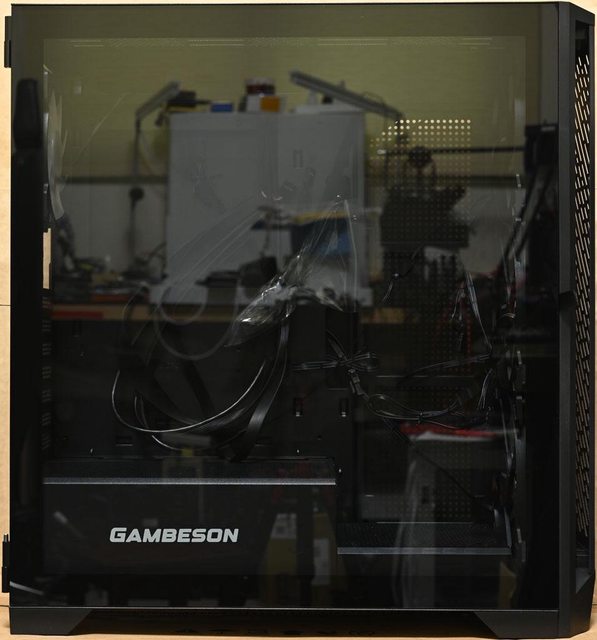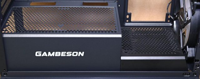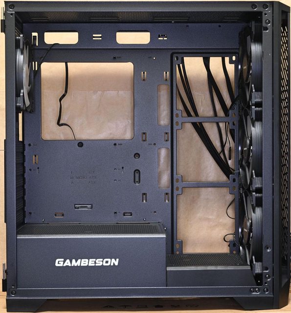 ▼機殼左側配置圖,主機板/介面卡安裝區與電源艙採隔離設計,電源艙有商標。底板上