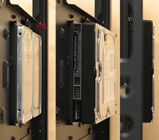 ▼雖然固定板上有3.5吋裝置的固定孔,不過底板與右側板距離18mm,安裝3.5吋裝置時會