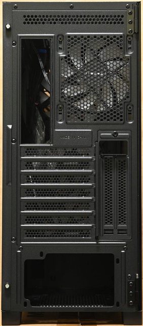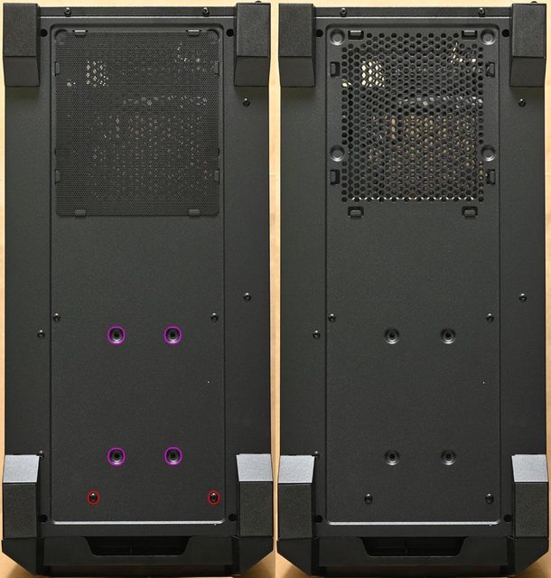 ▼後方右上通風口可裝1個120mm風扇,下方電源供應器安裝位置僅提供單一安裝方向螺絲