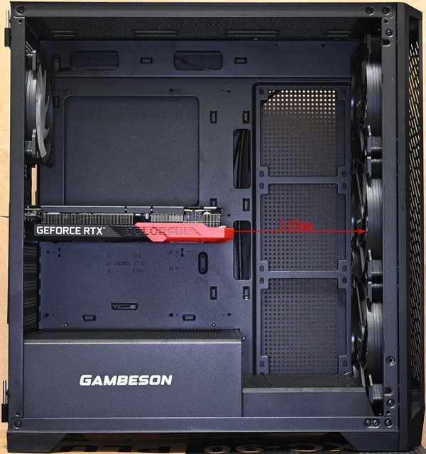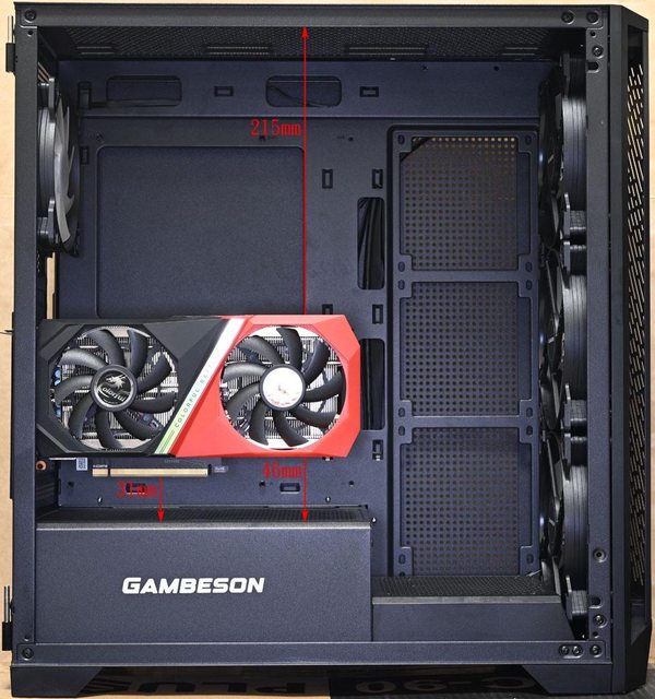 卡頂端距離頂部215mm(未安裝風扇/水冷排),顯示卡底部距離電源艙頂部46mm,金手指底
