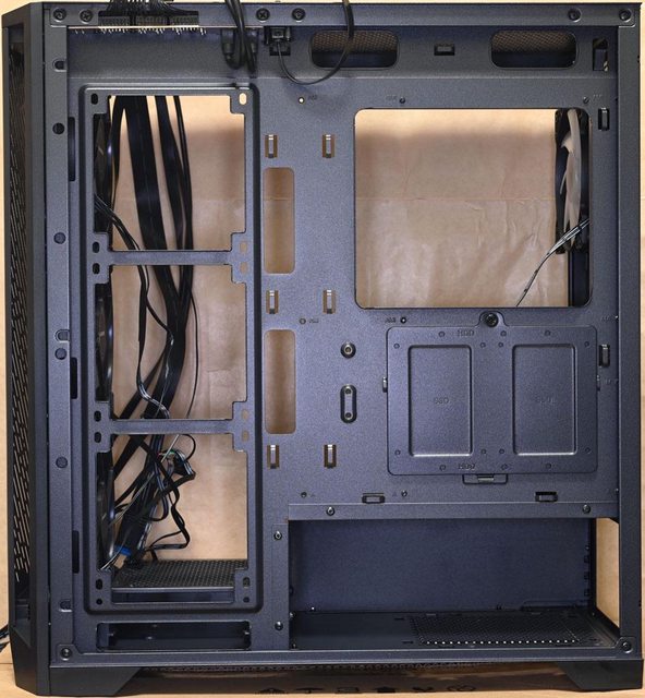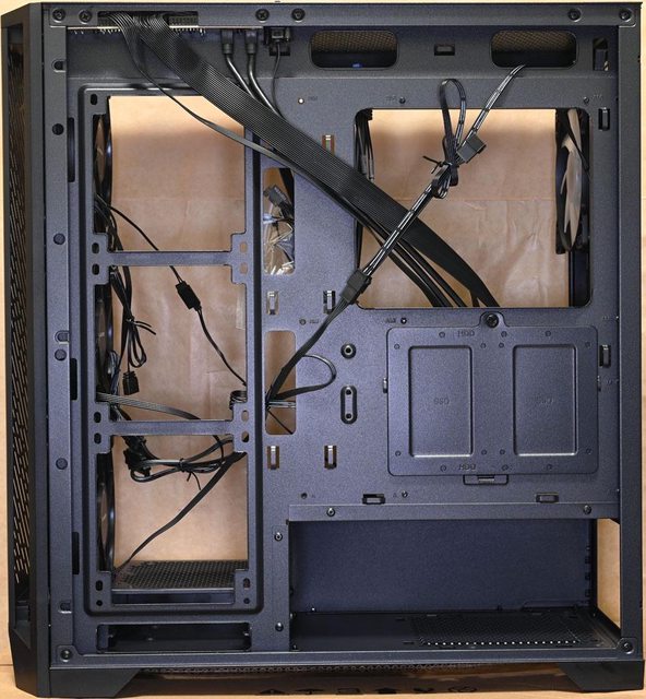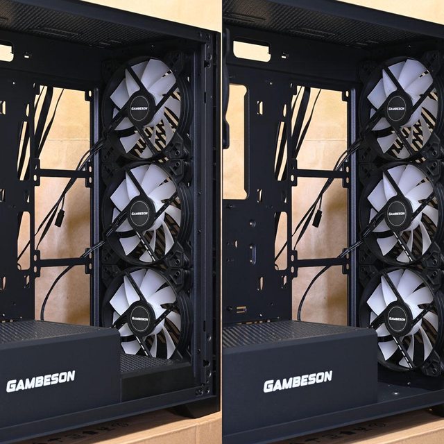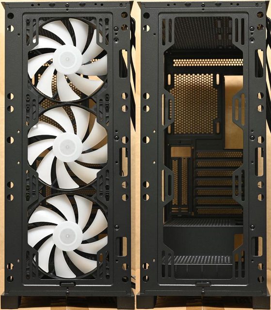 方/前端設有穿線開孔,右側前方可裝3個120mm風扇,水冷排可裝240mm