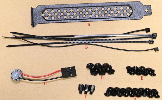 置螺絲(E)、主機板銅柱(F)、主機板/2.5吋裝置螺絲(G)