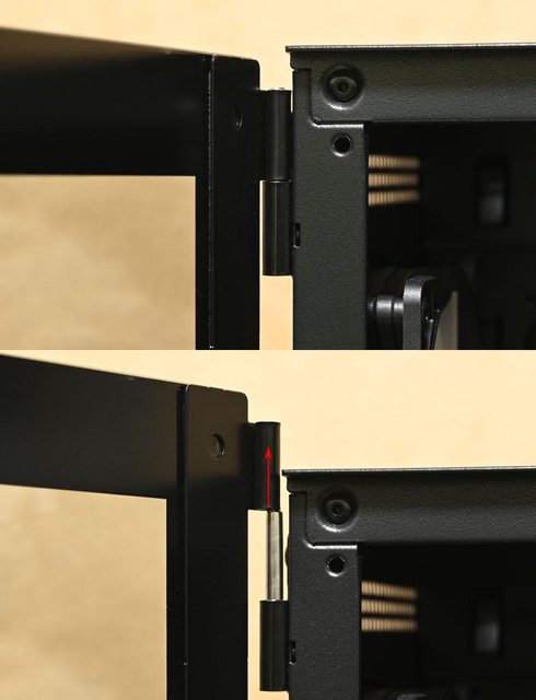 ▼左側強化玻璃側板其中一邊安裝鉸鍊,讓側板可以像門一樣開關,並透過磁吸方式固定