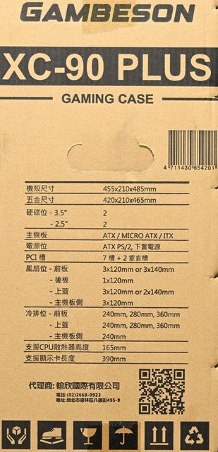 ▼外箱兩側有商標、產品名稱、提把開口、條碼、產品規格、廠商名稱/聯絡方式、QR碼