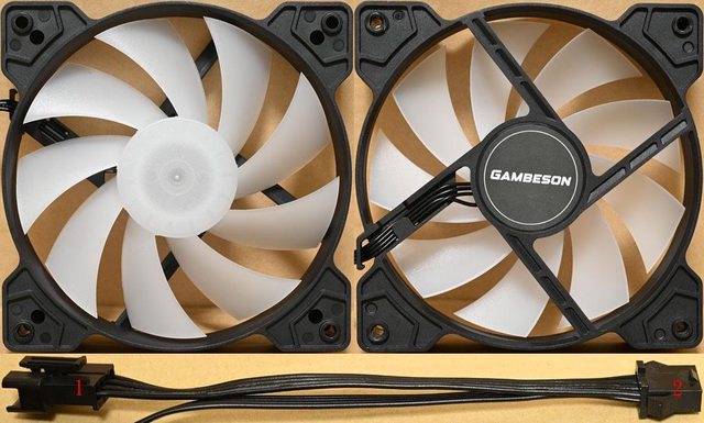 ▼120mm ARGB從控風扇,乳白色9葉片扇葉軸心內有發光LED,黑色扇葉外框有商標貼紙,