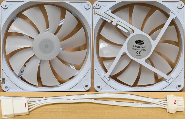 ▼140mm ARGB從控風扇,乳白色11葉片扇葉軸心內有發光LED,白色扇葉外框貼紙有商標