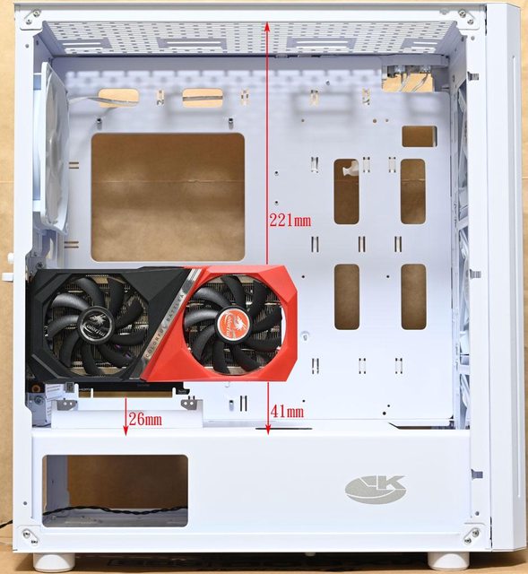 卡頂端距離頂部221mm(未安裝風扇/水冷排),顯示卡底部距離電源艙頂部41mm,金手指底
