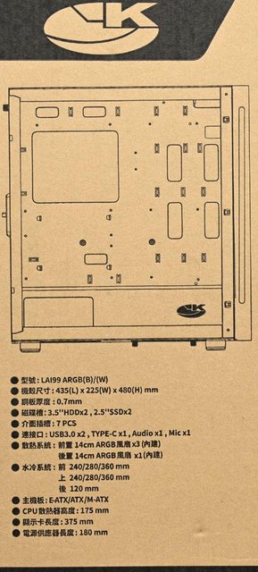 ○前方/後方/頂部可裝最多7個120mm風扇,前方預裝3個140mm ARGB風扇,後方預裝1個