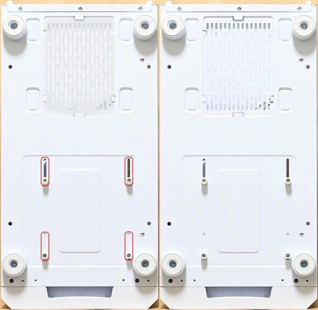 ▼機殼底部圓柱腳座有防滑墊,底部電源進氣口配置嵌入式過濾網,底部3.5吋/2.5吋抽