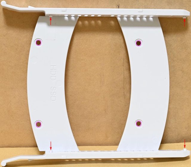 ▼托盤兩側有3.5吋裝置免螺絲卡榫(紅色箭頭),底部有2.5吋裝置(紫色框)固定孔