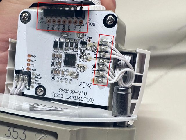 風扇線材連接位置,線材直接焊在PCB板上,一樣提供5V ARGB及PWM風扇訊號。左側三條