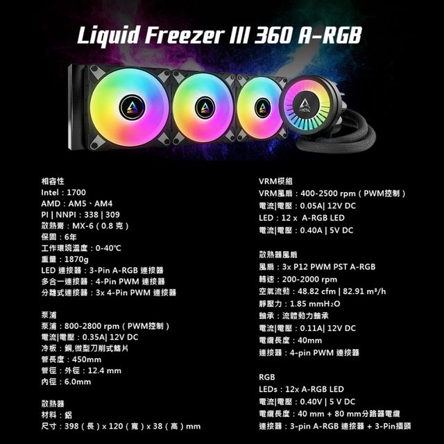 擷取代理商樂維的規格頁面供參,本次Liquid Freezer III A-RGB水冷採用新款自家研發