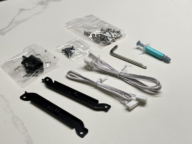 配件盒內有AM4/5扣具及LGA1700扣具用螺絲、冷排螺絲、冷頭線材兩款及簡易梅花板手、