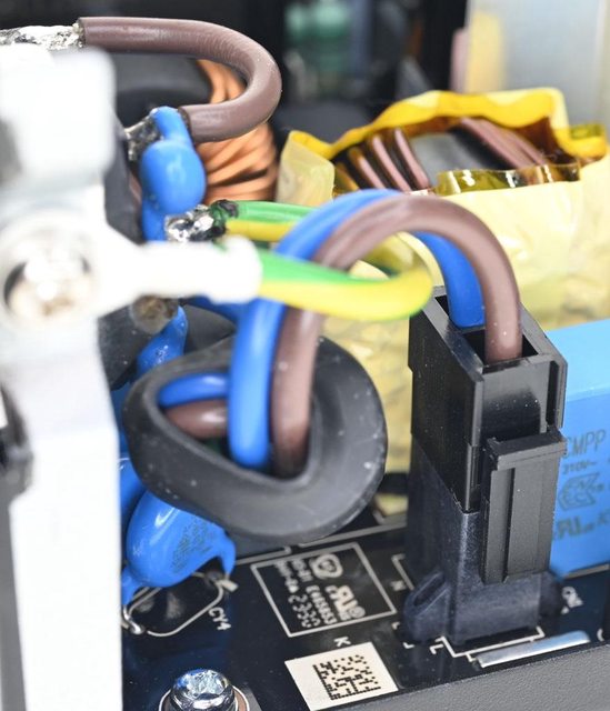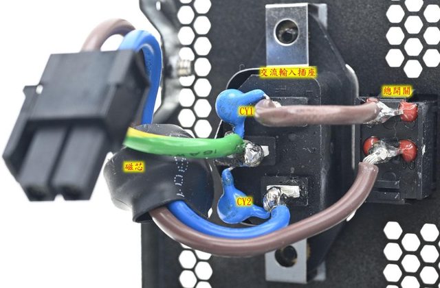 ▼交流輸入插座焊點加上2個Y電容(CY1/CY2),磁芯有包覆套管,交流輸入插座及總開關