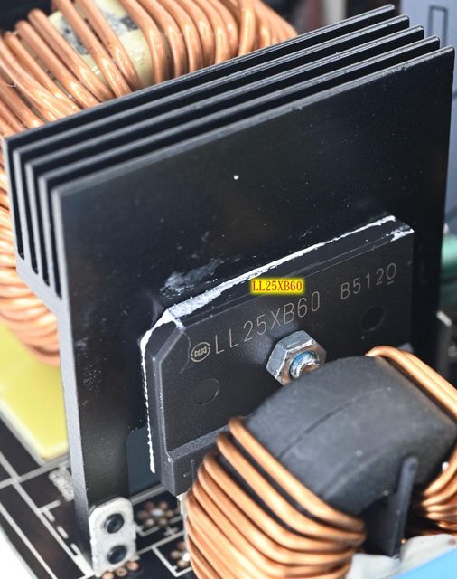 ▼Shindengen新電元LL25XB60低導通壓降橋式整流器固定在散熱片上,後方有環狀磁芯