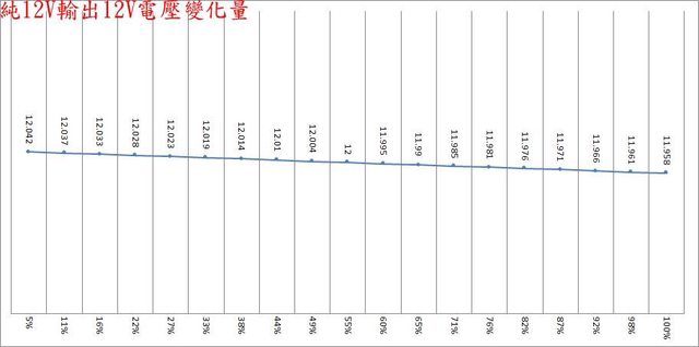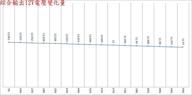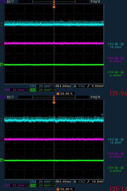 分別為33.6mV/11.2mV/9.6mV,於純12V全負載輸出下12V/5V/3.3V各路低頻漣波分別為