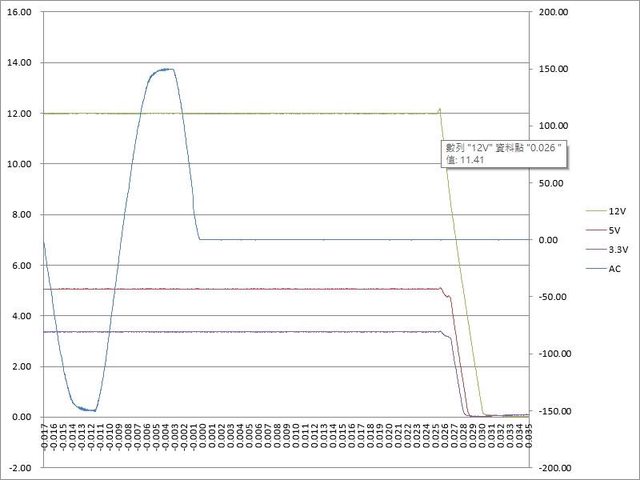 ○綜合全負載輸出狀態切斷AC輸入模擬電力中斷,12V於26ms降至11.41V