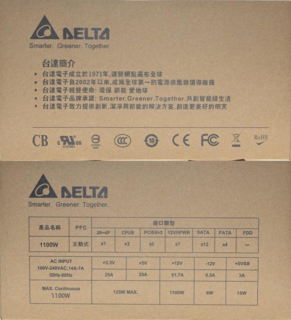 ▼外盒正面有Delta商標/標語、80PLUS白金認證、廠商名稱、產品特色、產品名稱、