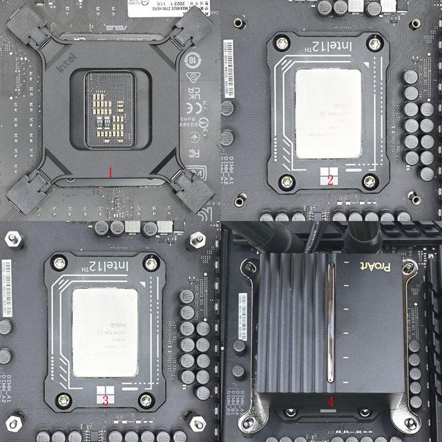 散熱器孔位會露出4支高度相同的固定鎖點(2),將4支LGA1700螺柱鎖入固定鎖點(3)。安