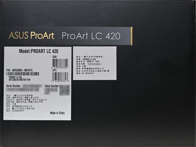 ▼外盒正面有ASUS ProArt金色標誌、ProArt LC 420 CPU LIQUID COOLER產品名稱、