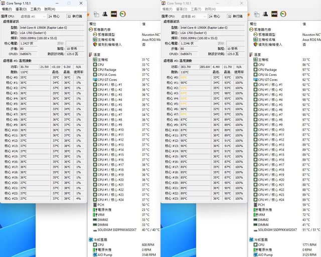 ▼待機(左)及高負載(右)的CORE TEMP及AIDA64感測器畫面