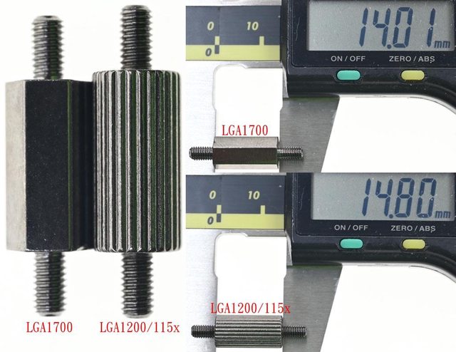 ▼LGA1700螺柱為六角形,長度14mm;LGA1200/115x螺柱為圓形加上直條紋溝槽,長度