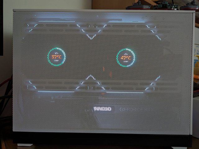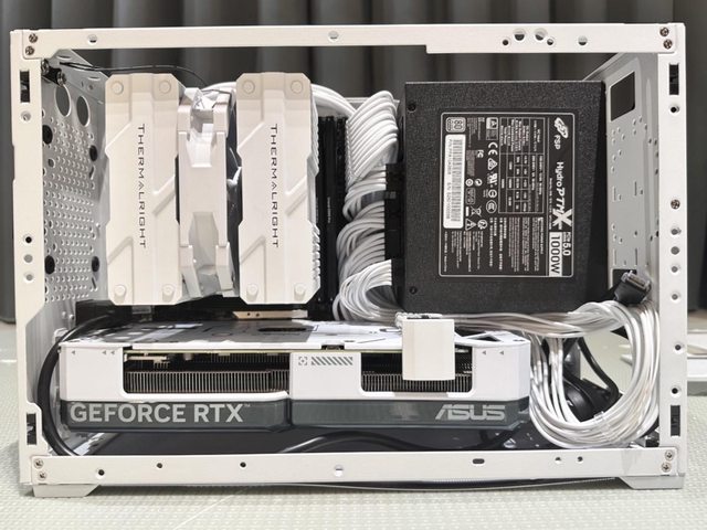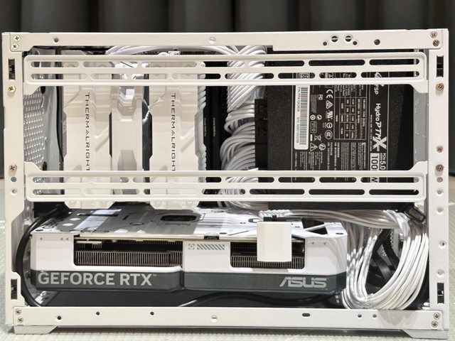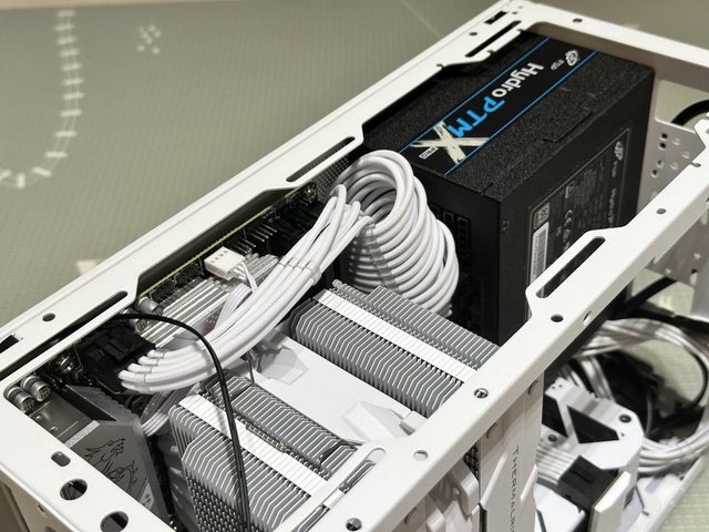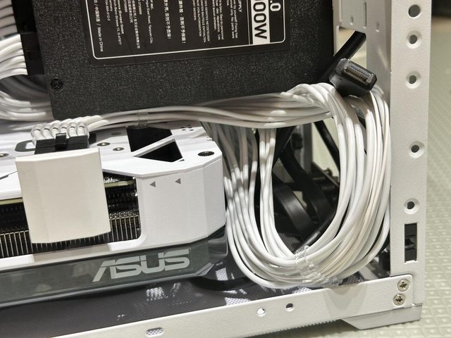 完成裝機的樣貌參考,因為白色訂製線長度係針對ATX機殼設計,所以長度略長,需要較