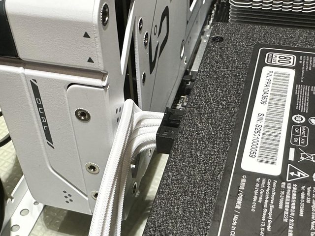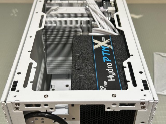 搭配13cm短機身的全漢Hydro PTM X ATX電源,如支架設為朝下出線,雖然電源本體空間