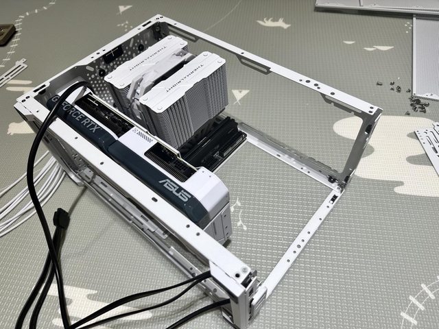 用文字描述有些許複雜,還是實際安裝看看吧!先安裝上ITX主機板、散熱器及顯示卡,