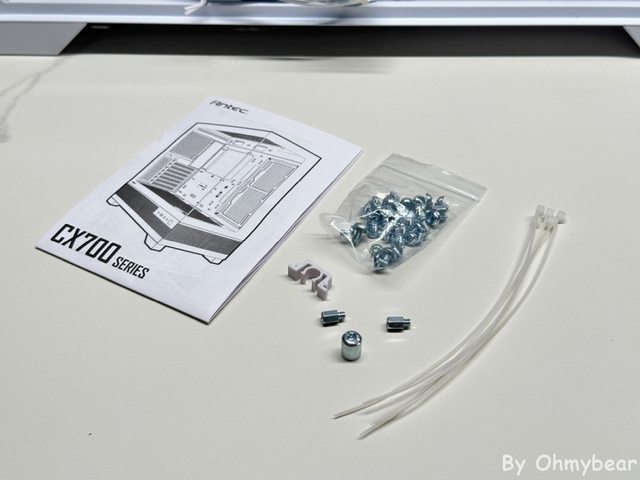 配件有裝機螺絲、半透明束線帶、卡榫備品、主機板用銅柱及說明書。