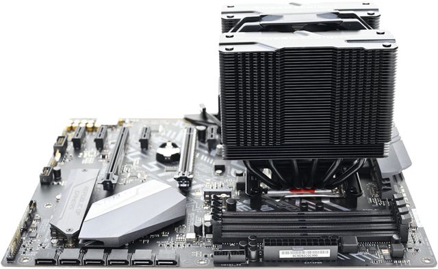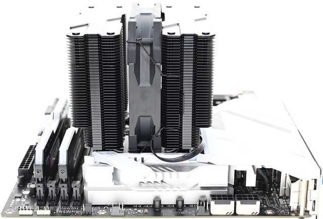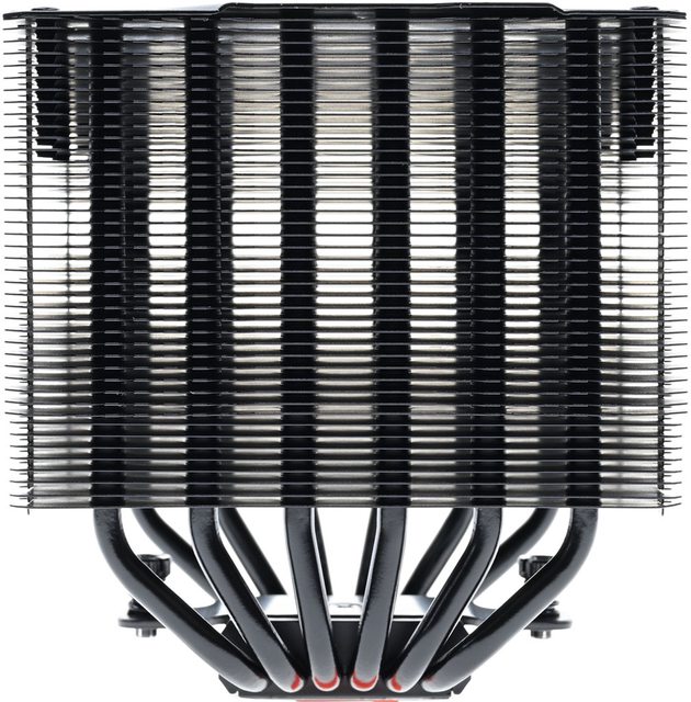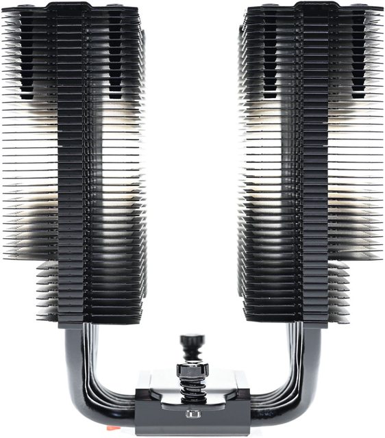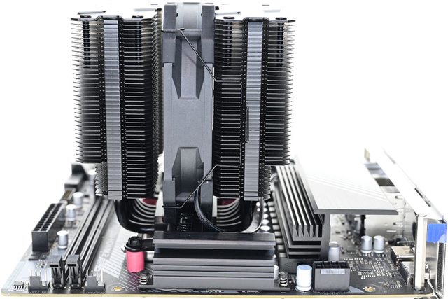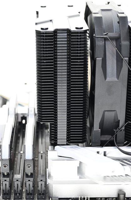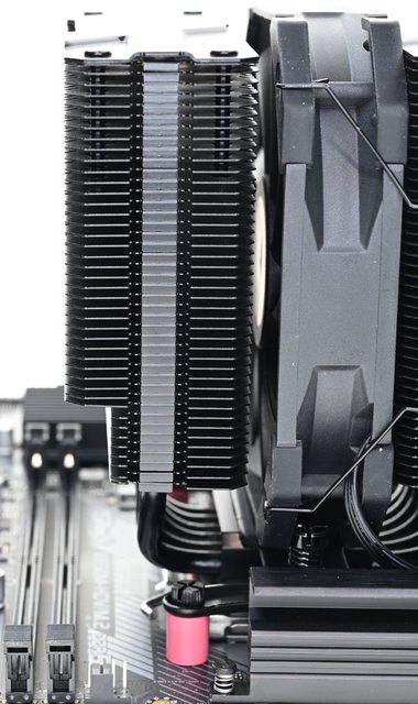 42層高密度鰭片,最下方8片鰭片裁切以閃避記憶體,熱導管與鰭片均採黑化處理,頂部