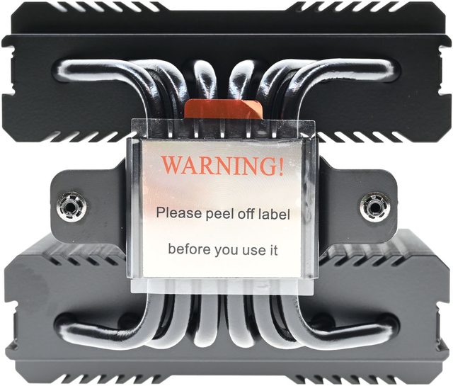 ▼散熱器底座的處理器接觸面有保護貼,上面用英文標示"警告!使用前請撕除保護貼"