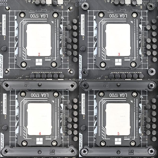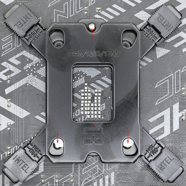 LGA1700托架固定柱有黑色墊片那面朝下鎖入固定螺牙(3),4個固定柱完全鎖入固定螺牙