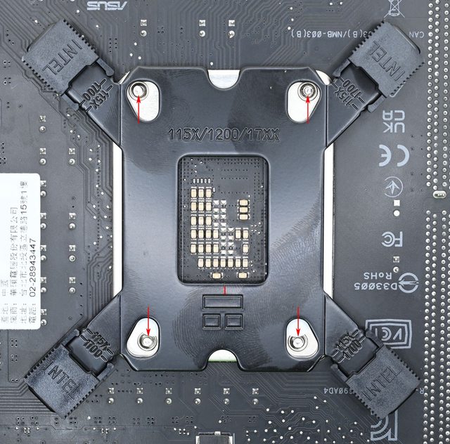 LGA1200/115x托架固定柱有黑色墊片那面朝下鎖入固定螺牙(3),4個固定柱完全鎖入固定