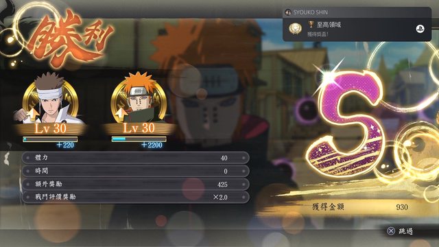 熟練度麻煩就在於你不能直接連段去打敗對手,使用忍術或支援都有額外分數,然後戰鬥調整成3回合分數會更多!!正常一場戰鬥大概300-400