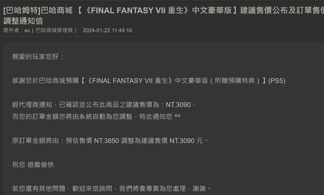 親愛的玩家您好: 感謝您於巴哈商城預購【《FINAL FANTASY VII 重生》中文豪華版(附贈預購特典)】 (PS5) 經代理商通知,已確認並公布此商品之建議售價為:NT.3090, 而您的訂單金額亦將由系統自動為您調整,特此通知您 ^^ 原訂單金額將由:預估售價 NT.3850 調整為建議售價 NT.3090 元。 祝您 遊戲愉快 若您還有其他問題,歡迎來信詢問,我們將會專責為您處理,謝謝。 變便宜了 -- ※ 發信站: 批踢踢實業坊(pttweb.org.tw), 來自: 114.26.11.163 (臺灣) ※ 文章網址: https://pttweb.org.tw/PlayStation/M.1705912847.A.9E3