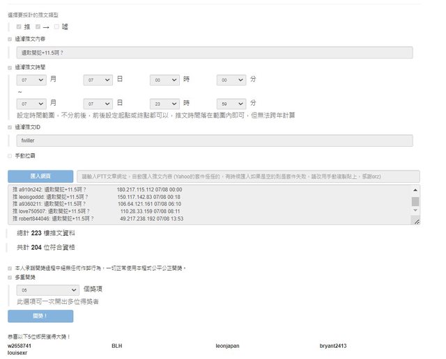 抽五位 時間內 有推文關鍵字 無重複帳號