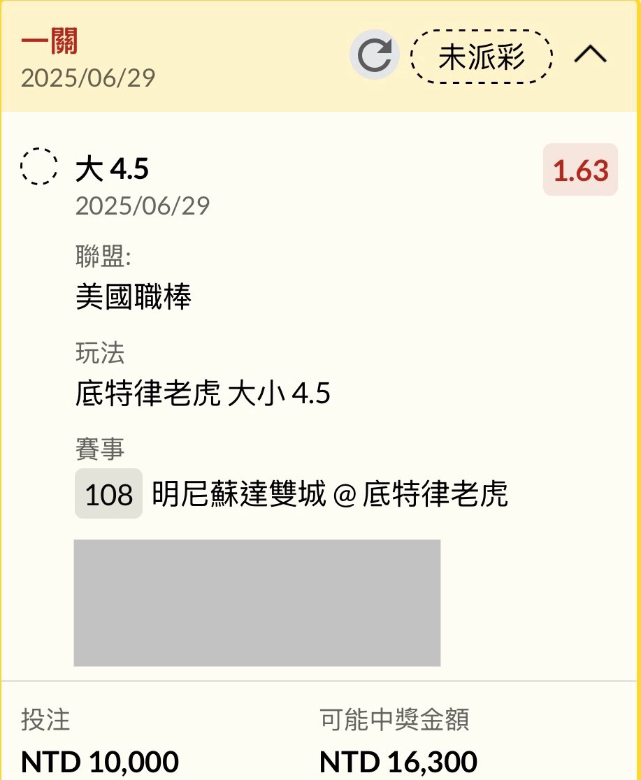 → sulaeric: 收工。老虎-1.5 線上等 101.12.113.234 06/29 02:23
